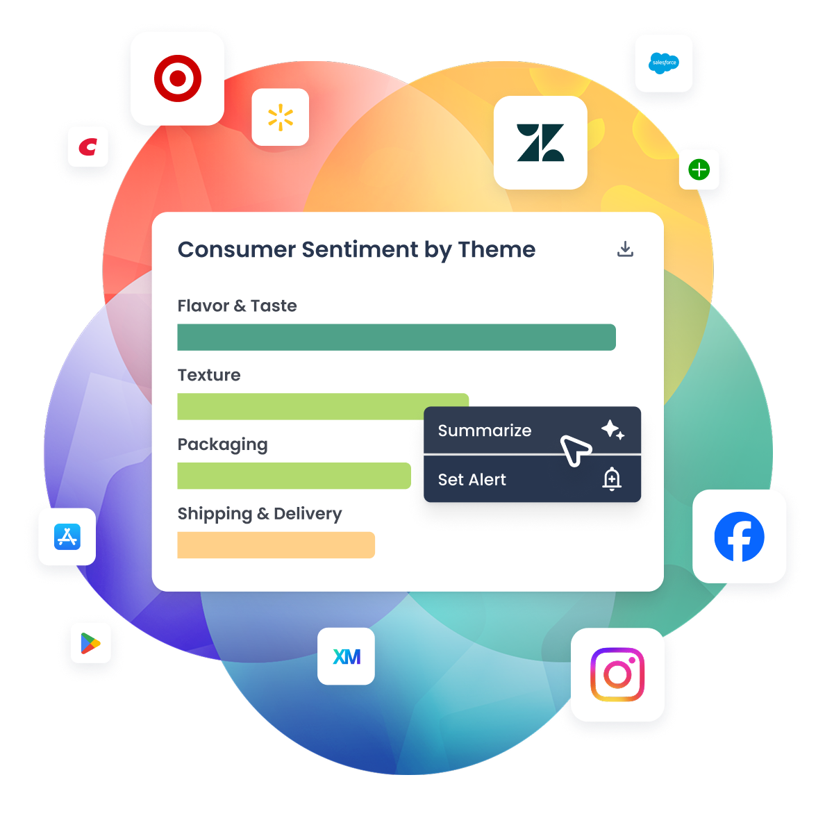 Yogi connects to over 350 retailers, customer care systems like Zendesk and Salesforce Service Cloud, survey tools like Qualtrics, and app stores and social platforms—creating one unified, AI-powered view of consumer sentiment.