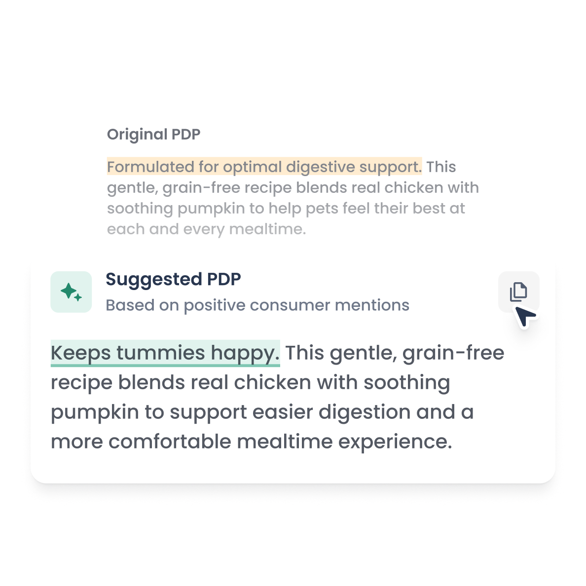 Yogi identifies which claims drive trust, loyalty, and conversion by analyzing real pet parent language and sentiment. It maps feedback to claims like “natural ingredients,” “long-lasting,” or “made in the USA” and scores which ones actually resonate—helping teams optimize packaging, PDPs, and campaigns for credibility and conversion.