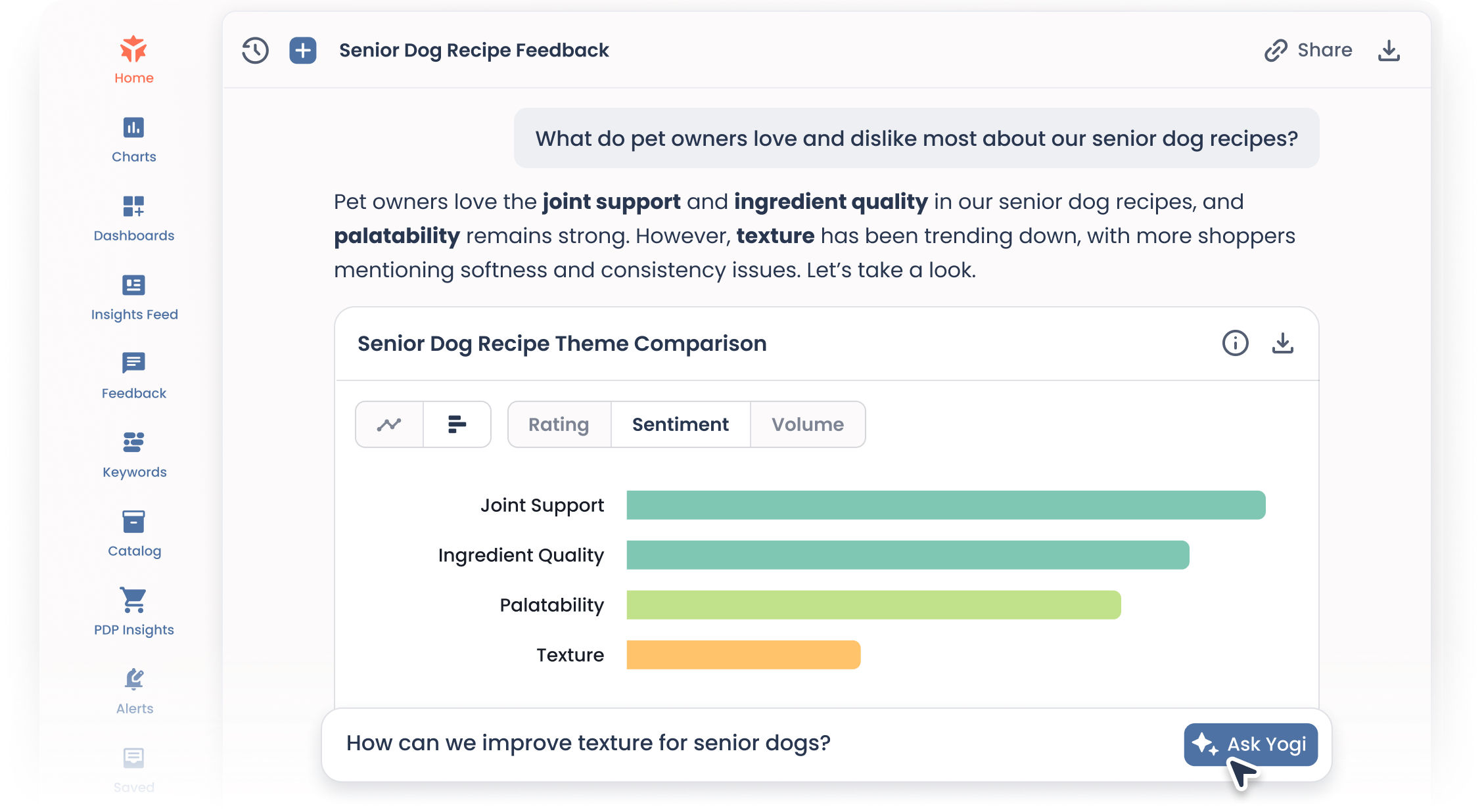 Unlike social listening tools that focus on mentions, or review platforms that only track ratings, Yogi unifies every feedback source into one intelligent view—your Unified Voice of the Consumer (UVoC). It not only shows what pet parents are saying but reveals why they feel that way—empowering pet brands to fix issues, validate claims, and innovate faster.